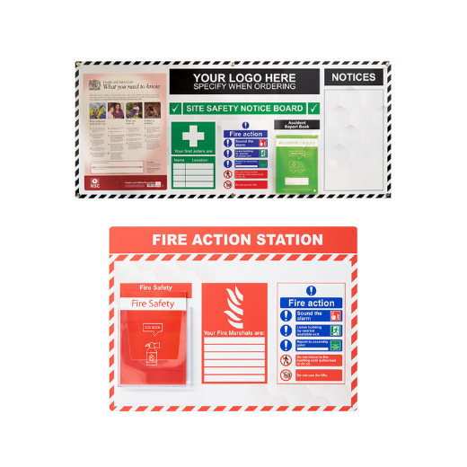 Two common types of safety stations are first aid stations and fire action stations. Companies should also consider including a HSE poster on their safety stations, as employers are legally required to provide each of their workers with the equivalent leaflet. The HSE leaflet space can be found on the left-hand side of the safety station image below.