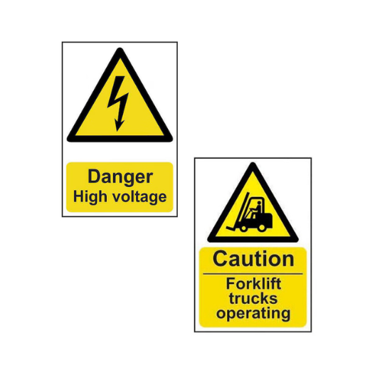Hazard Warning: Inform staff and visitors of a nearby hazard which could pose a risk to health or well-being. Typically used in electrical rooms, plant rooms, or areas with machinery. Some examples include: